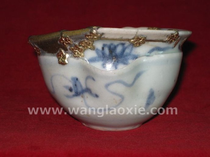 這是一窯粘雙杯,是兩個不同畫法的杯子,不知何種原因鬼使神差的裝在一個窯裏,又不知何種原因致使窯塌,窯中燒的瓷器粘連成砣,窯棄荒山···,千百年後重見天日,我用鋦瓷藝術;把唐代邢窯殘片和現代土柴窯燒制的陶瓷殘片隨意拼合,居然形似一個壽桃,與杯中的壽字天意璧合,我精做細研,用了嵌絲梅花絕技加平鋦、鑲嵌與之鋦聚和合,嫣然成器,取名;鋦聚和合長壽杯,真是一種超脱的享受···
