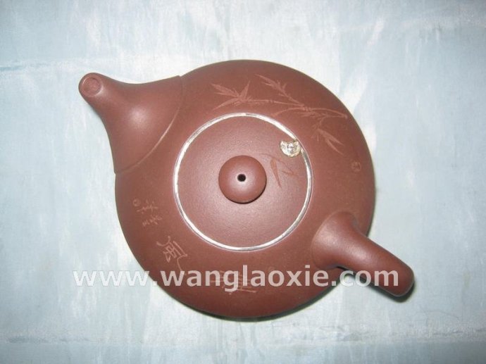 來時壺蓋是貼銀膠粘的,拆除後把膠清理幹淨,用銅包全口並鋦一花釘掩蓋破損處、蓋牆貼鑲嵌,另一把壺嘴磕掉,對茬平鋦、加簽名釘。