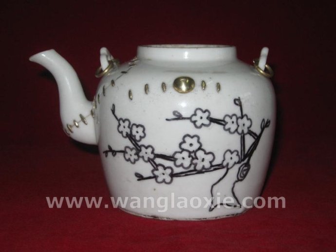 七年前在舊貨攤尋得一把民國提梁壺;當時是無提梁、無蓋、前耳壺身和壺嘴根有環形裂紋,並且有民國工‘行’活的鋦釘15個、壺底橫通到壺身有一道開叉裂紋、壺肩有一橫紋、壺內漏缺失。我用家傳独門絕技鋦藝的‘當’活在此基礎上加鋦釘39個、配梁加肩隔、壺蓋實在是無法尋配,不得以我只好用一個碗底改制,並且包全邊口、用‘大漠石珠’做鈕,配‘嘉慶’大錢做隔片《套釘鑲嵌》、銅片做七孔內漏、壺身開叉紋用《貼鑲嵌》和《嵌絲梅花》的鋦藝做了一副‘十二朵梅花圖’、熟刻“禪茶一味”十六字滾籠詩、雙和標識、簽名釘。